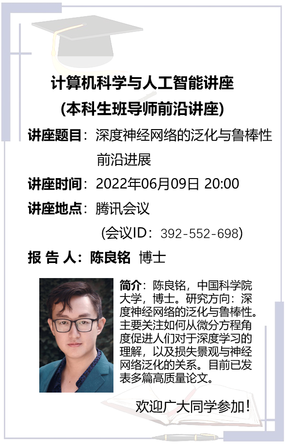 6月6日,我院邀请中国科学院大学博士陈良铭做了主题为《深度神经网络的泛化与鲁棒性前沿发展》的线上讲座,讲座由我院教师、软工205班班导师魏培阳主持。学院2000级本科生和部分研究生参加了本次线上讲座。