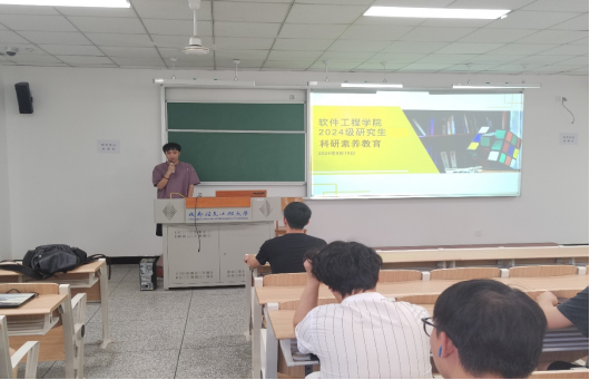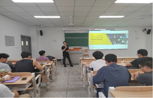 9月19日下午我院在第一教学楼H1202召开2024级研究生“培育科研素养,成就卓越研究生”新生入学教育主题班会。2022级杨宇杰学长分享科研实践经验,研究生辅导员张俊锋老师主持班会,全体2024级研究生出席。