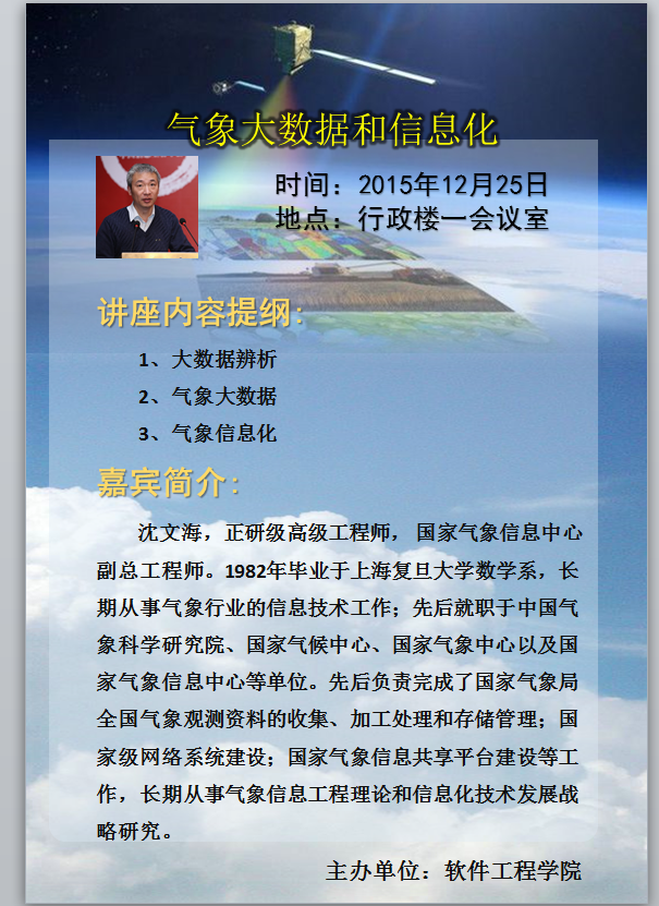2015年12月25日(本周五)上午10:00将在行政楼一会议室举行由软件工程学院承办由国家气象信息中心副总工程师沈文海主讲的关于“大数据和信息化”的讲座,欢迎全校广大师生踊跃参加!
