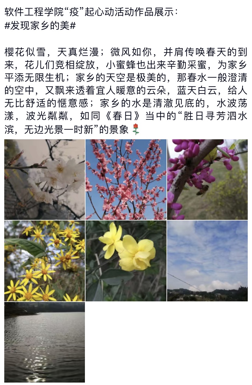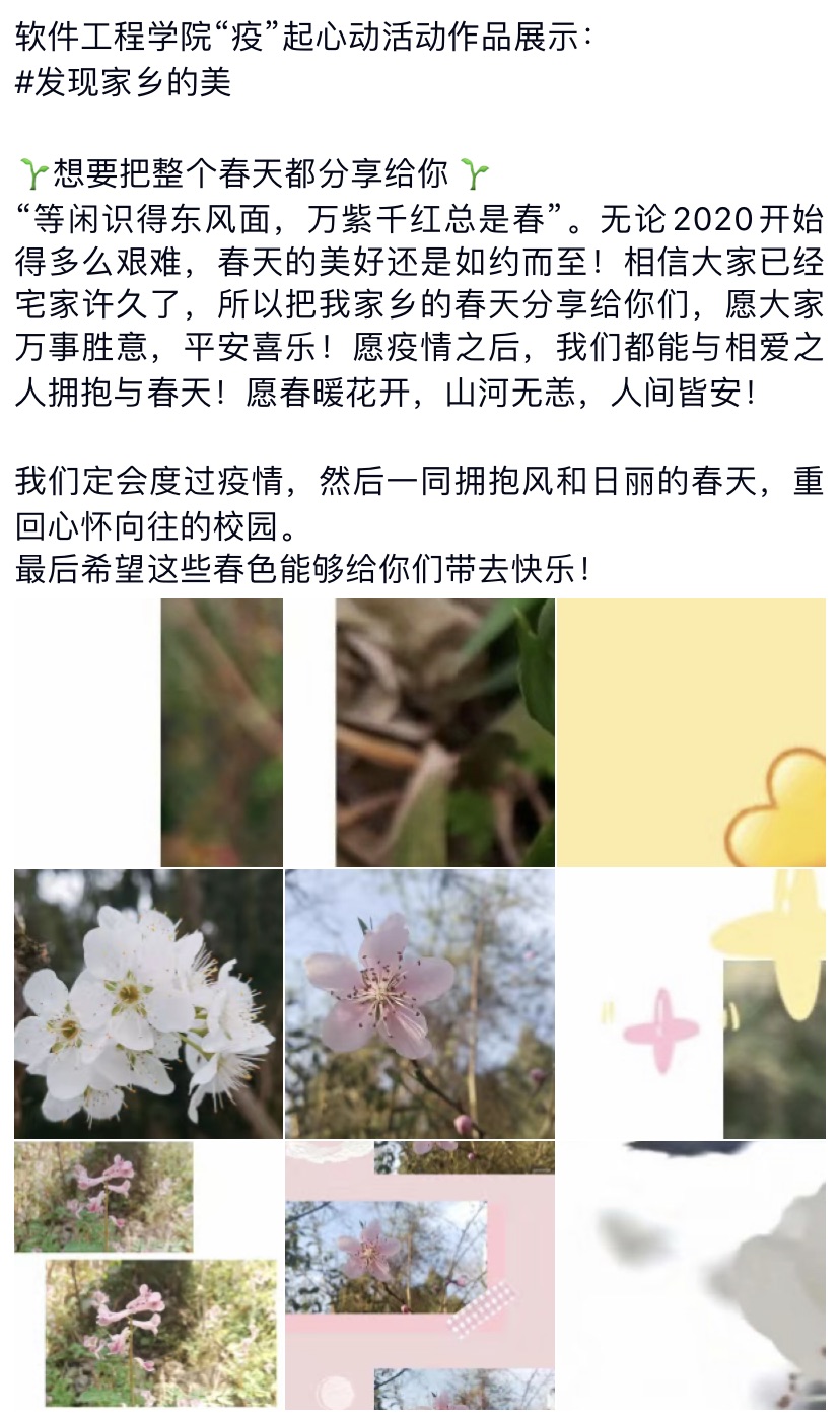 2020年3月20日,由软件工程学院团委、学生会办公室组织开展“疫”起心动活动圆满结束,活动旨在开展以在线上投递“家有萌宠”、“发现家乡的美”、“温馨小故事”为主题的活动给在疫情期间待在家里的同学带来温暖。