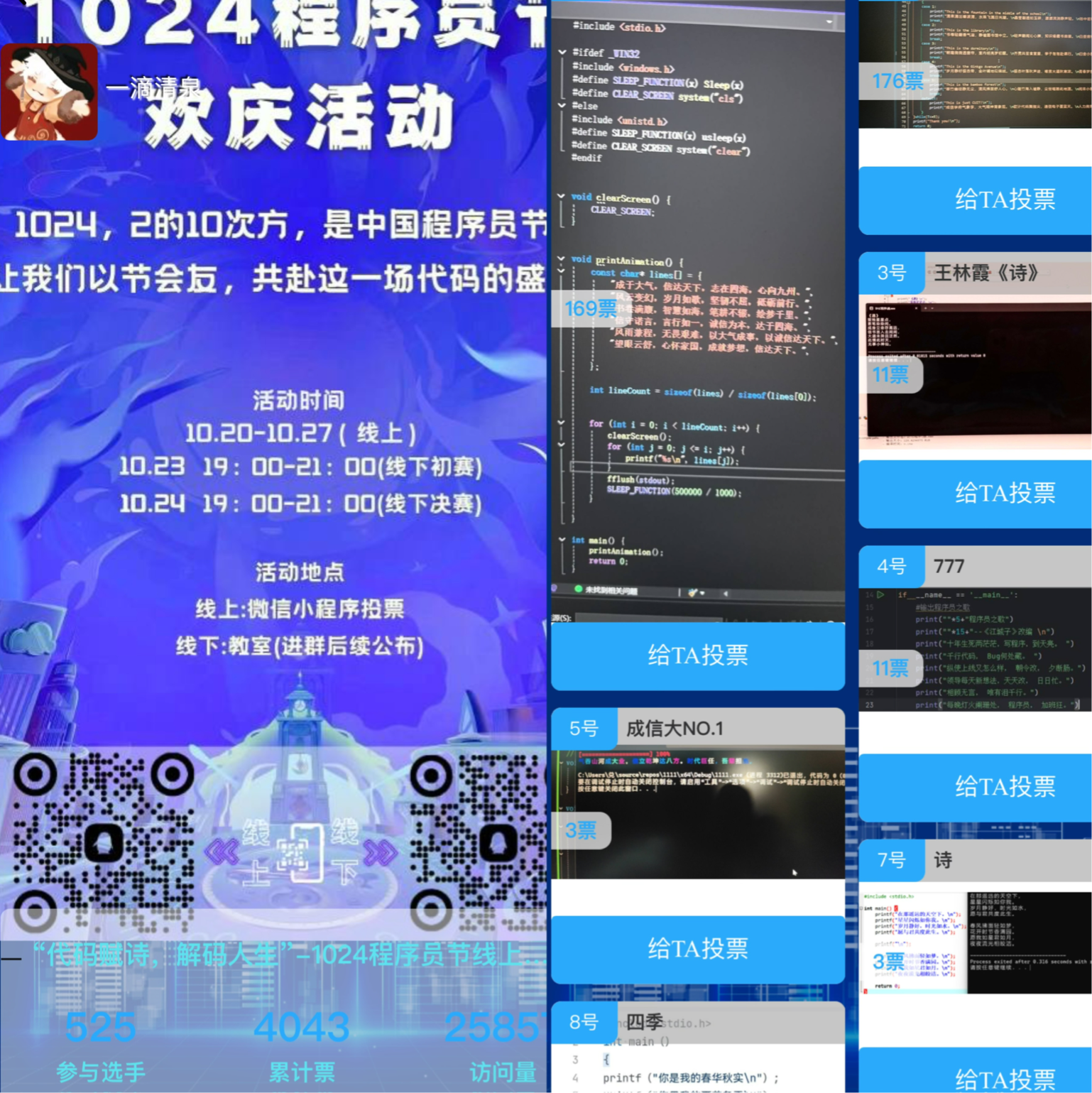 活动分为线上、线下两部分组成,在线上开展的“代码赋诗”活动吸引了四个学院500余名同学的积极参与,线下“解码世界”知识竞赛活动迎来参赛队伍达40支,各队展现出了广博的知识储备,面对较高难度系数的知识问答题目也能展现出成信学子应有的风采。并于10月24日当天在银杏大道举办了游园会活动。