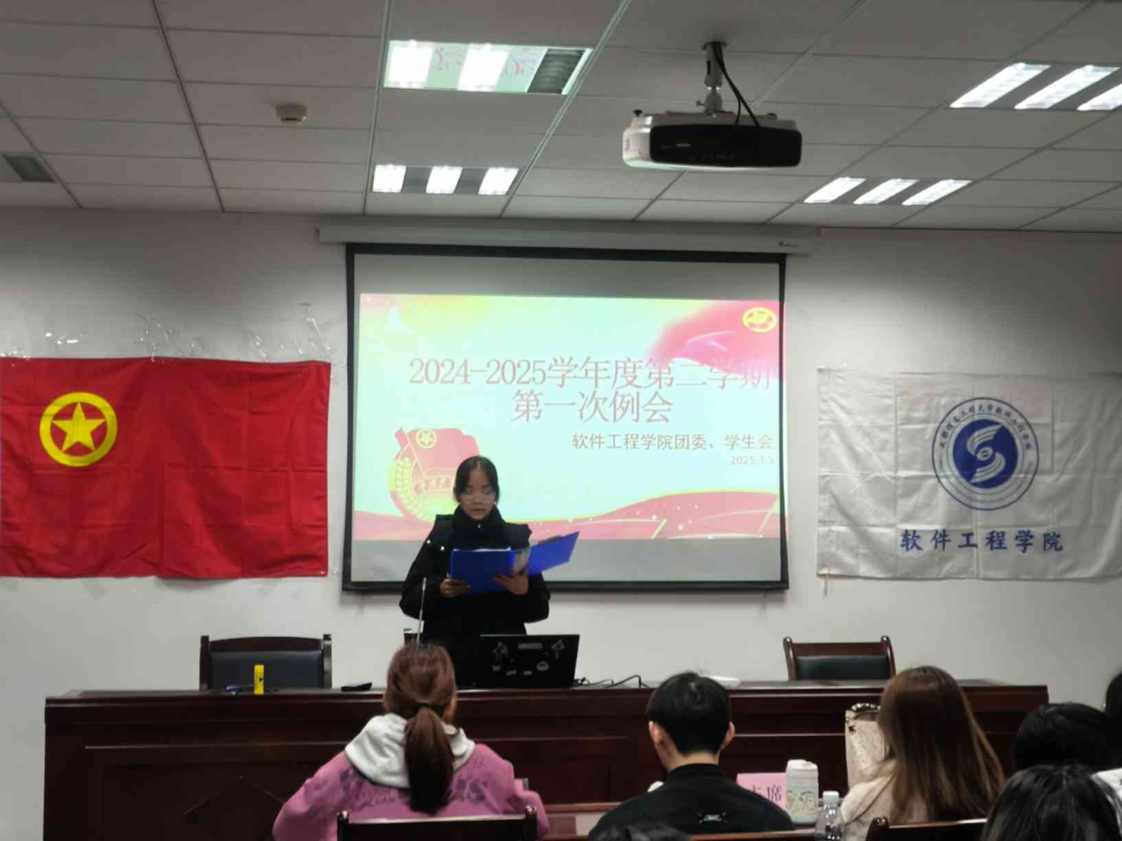 2025年3月5日,软件工程学院团委、学生会于航空港校区双中心A502教室召开本学期第一次例会,软件工程学院团委书记胡培老师,软院团委、学生会主席团及各部门部长参与本次会议。