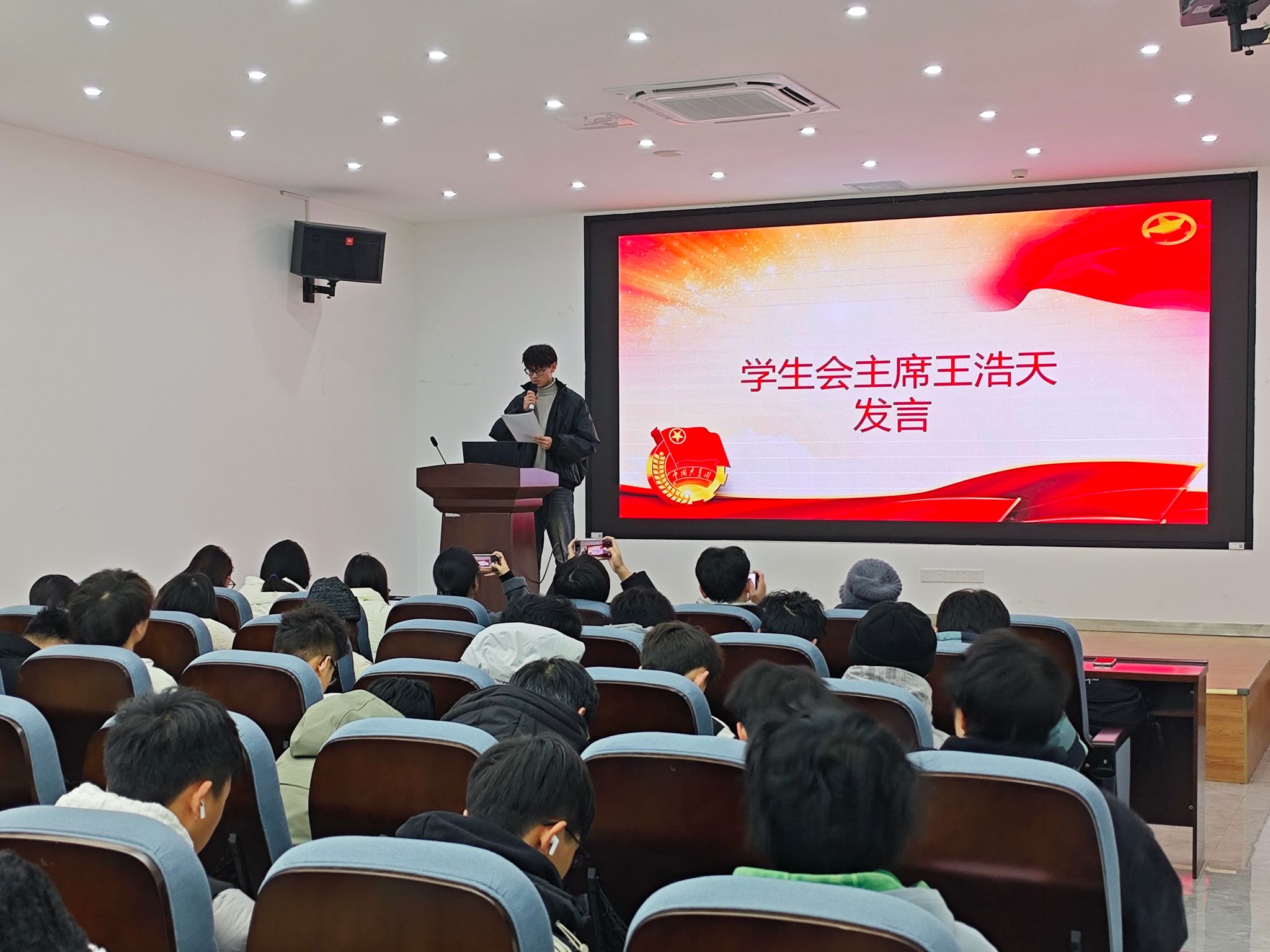 随后,学生会主席王浩天代表主席团发言。他全面回顾了本学期工作,肯定了各部门在活动组织、志愿服务、宣传报道等方面取得的成绩,同时也指出了工作中存在的不足,并对下一阶段的重点任务进行了部署,鼓励全体成员继续保持积极进取的态度,以更高的标准履职尽责。