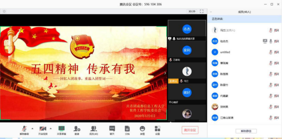 送走繁花似锦的春天,我们又迎来了热情似火的夏季。值此光辉的“五四”青年节之际,软件工程学院团委、学生会于线上举行了以“五四精神,传承有我”为主题的团日活动,软工团委、学生会全体成员参加了本次活动。