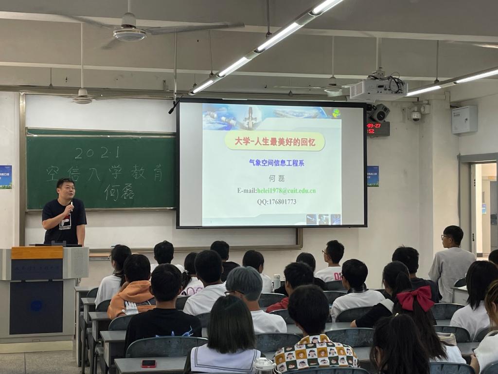 为帮助气象空间信息工程系2021级新生了解所学专业,明确学习目的,找准专业方向,更快地融入大学生活,2021年9月27日下午,气工系何磊老师在教学楼1204为本科新生分享了入学教育课—大学-人生最美好的回忆。