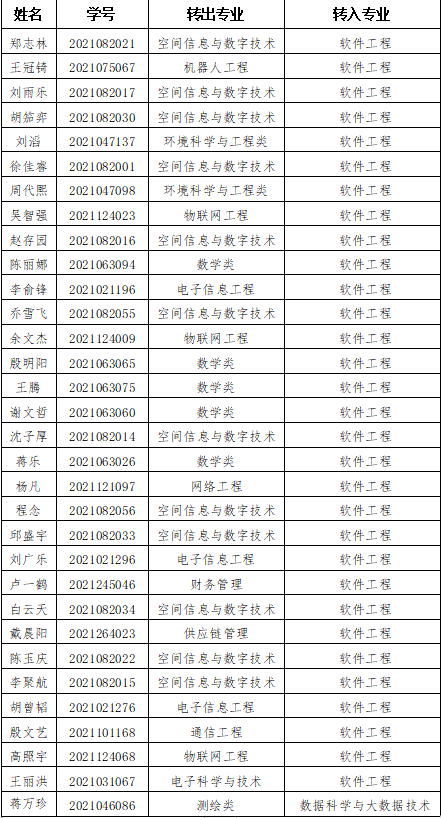 现将2022年拟转入软件工程学院学生名单予以公示,公示时间为2022年1月17日-1月21日,公示期间如对软件学院转专业拟录取名单名单有异议,请邮箱联系软件工程学院教务处教务科杨老师,邮箱:rjgcxyjx@cuit.edu.cn。公示期间如无任何疑问,即视为转专业成功。