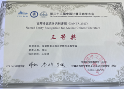 在本次大会“古籍命名实体识别评测(GuNER 2023)”中,我院数据科学与工程系大数据技术与工程2021级硕士研究生蒋文在导师王亚强副教授的指导下,与来自北京大学、中国科学院、华中科技大学、中国电信、浪潮集团等国内顶尖高校、研究所、企业单位的127支队伍的比赛中脱颖而出,斩获第四名、三等奖的优异成绩,并在大会作技术报告。