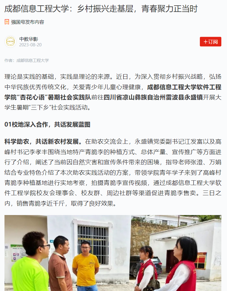 为深入贯彻落实习近平总书记给中国农业大学科技小院学生的重要回信精神以及总书记关于“三农”工作的重要论述,引领学生心系家国,厚植爱农助农兴农情怀,切实将课堂学习与乡村实践紧密结合,今年7月,我院“杏花心语”大学生暑期社会实践队(四川省省级重点团队),在指导老师张澄、万娟的带领下前往雷波县永盛镇开展大学生暑期“三下乡”社会实践活动,助力乡村振兴。活动获得学习强国平台报道。