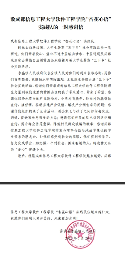活动结束后,“杏花心语”实践队收到当地政府发来的感谢信,对实践队在助力当地农产品销售、防诈反诈宣传以及青少年心理健康教育等方面提供的帮助表示衷心感谢。本次活动还得到了中青网、雷波视界、共青团雷波县委微信公众号等多家媒体平台的报道。软件工程学院“杏花心语”实践队为乡村振兴贡献大学生的青春力量,展现了我校学子有活力、有担当、有志向的昂扬风貌。