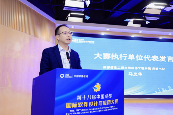 我院党委书记马义华代表大赛执行单位发言。他向长期支持和关心学校、学院发展的各级各部门和社会各界表示感谢。承诺成都信息工程大学软件工程学院将全力支持本届大赛,积极发挥高校在创新、科研和人才培养等方面的优势,为大赛提供技术保障和组织支持。他表示,学院将与其他执行单位密切沟通,加强协调,紧紧围绕大赛目标,切实做好从初赛、复赛到总决赛等各个环节的筹备组织工作,保证大赛质量。并将全过程强化细节落实、完善比赛标准,确保赛事公平公正,实现通过大赛选拔一批优秀软件人才的目标。