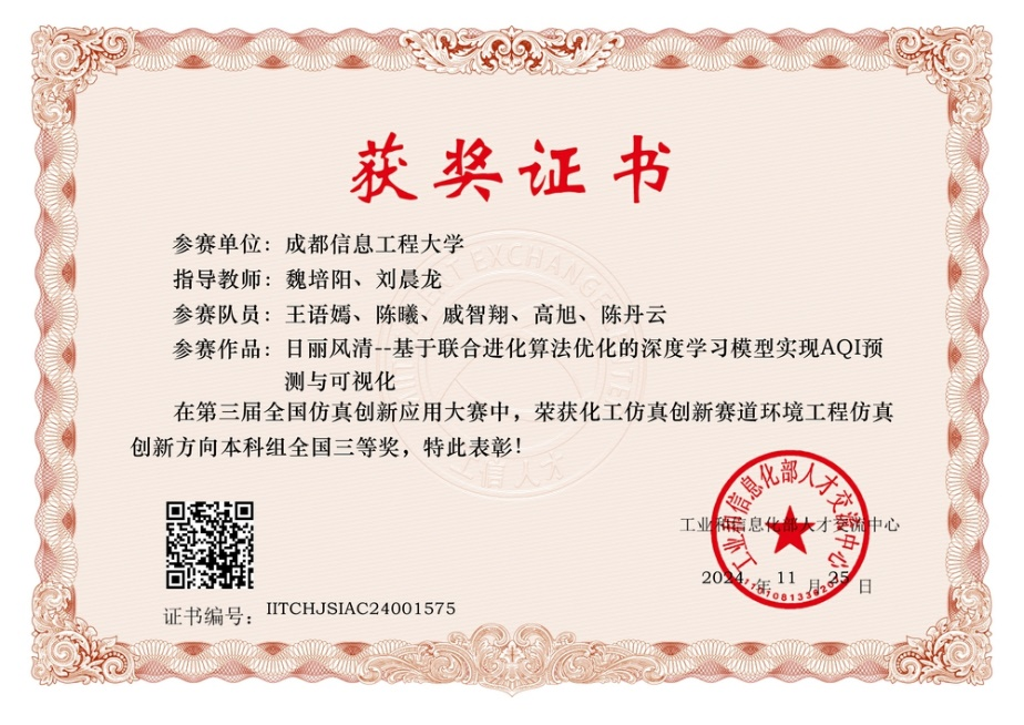 2024年12月,全国仿真创新应用大赛在西安西北工业大学落下帷幕。来自全国422所高校、企业、医学科学单位、军事科学单位及仿真领域的科研院所的1300余支队伍参加比赛。经评审专家初评、参赛团队分组线上答辩、线下仲裁等环节,在“环境工程仿真创新”赛道上最终评选出5件一等奖作品、4件二等奖作品、9件三等奖作品。由我校魏培阳、刘晨龙老师指导,我院王语嫣、陈曦、戚智翔,通信工程学院高旭,资源环境学院陈丹云等5位同学提交的作品《日丽风清—基于联合进化算法优化的深度学习模型实现AQI预测与可视化》斩获全国三等奖。
