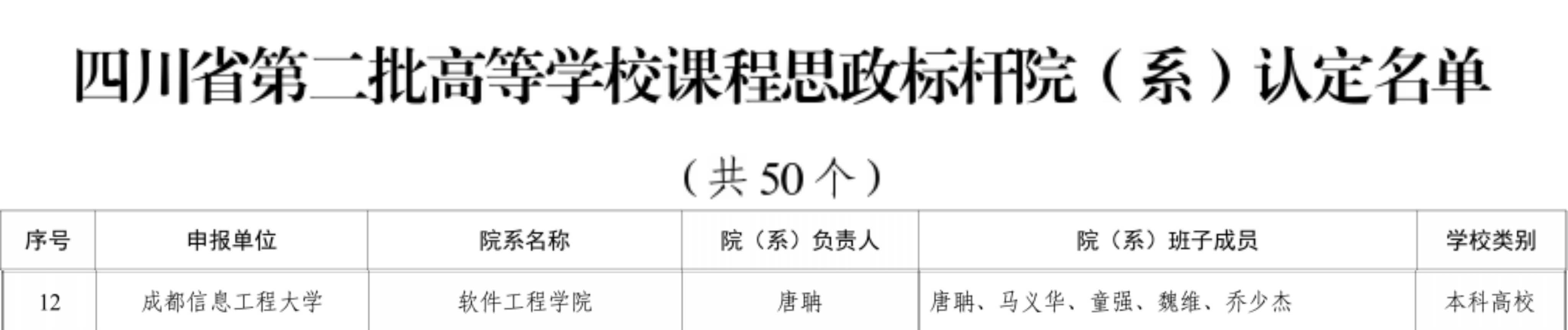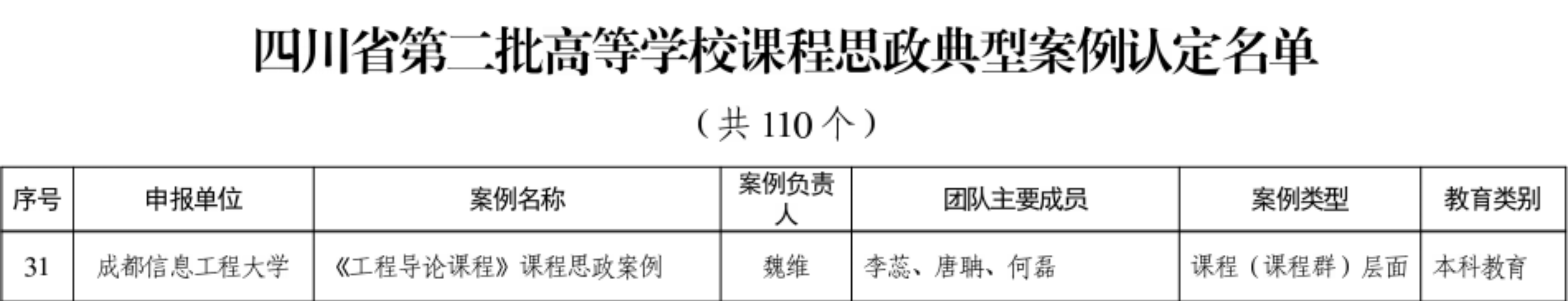 2025年4月9日,四川省教育厅正式公布了第二批高等学校课程思政标杆院(系)和课程思政典型案例认定名单。经各高校推荐、评审遴选等程序,四川省教育厅认定第二批高等学校课程思政标杆院(系)50个、课程思政典型案例110个。我院入选省级课程思政标杆院(系),教师魏维团队的《工程导论》课程入选省级课程思政典型案例。