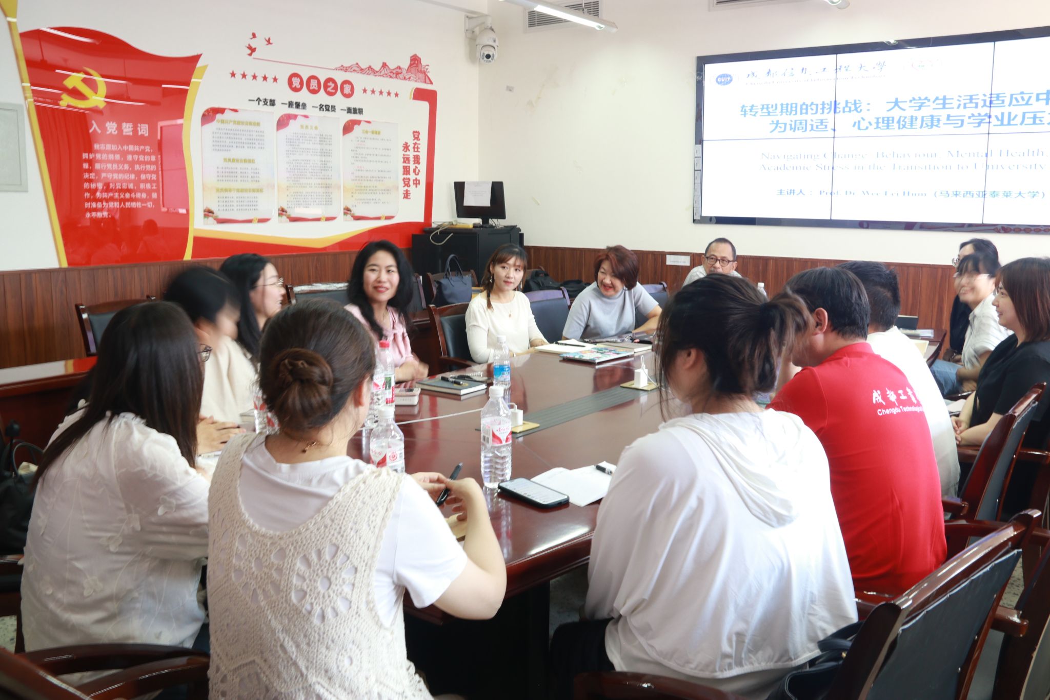 5月19日,成都工业学院团委书记兼学工处副处长白杨率该校省级名辅导员工作室“聆听心坊”辅导员工作室成员到我校,与我校省级名辅导员工作室软件工程学院“博雅心语”辅导员工作室开展交流。两工作室全体成员、我校学生处心理健康教育中心教师代表参加交流。活动还特邀马来西亚泰莱大学心理学专家Prof.Dr.Wee Lei Hum作有关心理支持事务探索的学术沙龙。