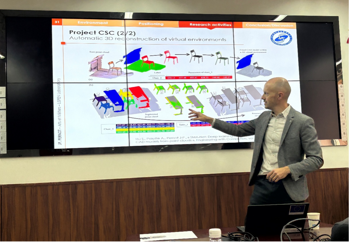 上午的国际交流研讨会在双中心B505会议室举行。学院院长唐聃教授致欢迎辞,对PERNOT教授与吕喆院士一行的到访表示热烈欢迎。随后,学院何磊教授就学科建设、师资力量及科研平台等方面进行了系统介绍。PERNOT教授代表法国国立高等工艺学校介绍了其学校概况及LISPEN实验室在数字工程与几何表示等方面的科研成果;吕喆院士则对苏州科技大学电子与信息工程学院的学科特色与研究进展作了说明。在合作商讨环节,双方就博士联合培养、科研项目合作、师生交流等议题进行了富有成效的探讨,为进一步深化国际合作奠定了基础。