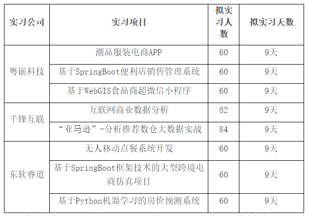 2022年“软件工程学院2019级学生集中毕业实习项目”,经学院对入围的三家公司:重庆粤嵌科技有限公司(以下简称“粤嵌科技”)、北京千锋互联科技有限公司成都分公司(以下简称“千锋互联”)、广州东软睿道教育信息技术有限公司(以下简称“东软睿道”)提交的实习方案从格式、方案内容设计与专业的契合度、方案实施可行性等方面进行了评审,遴选出符合学院此次毕业实习要求的实习项目共计8个。实习项目相关信息如下:
