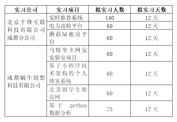 2023年“软件工程学院2020级本科学生集中毕业实习项目”,经学院对入围的两家公司:北京千锋互联科技有限公司成都分公司、成都蜗牛创想科技有限公司提交的实习方案从格式、方案内容设计与专业的契合度、方案实施可行性等方面进行了评审,遴选出符合学院此次毕业实习要求的实习项目共计7个。实习项目相关信息如下: