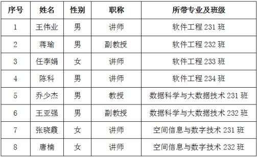 根据《成都信息工程大学本科生班导师制实施办法》《软件工程学院班导师工作指导意见》相关文件要求,为加强学院班导师队伍建设,充分发挥班导师在学生成长成才过程中的重要作用,经教师本人申请、系部推荐、资格审查,拟选聘王伟业等八位教师为2023级本科新生班导师。现将具体名单公布如下: