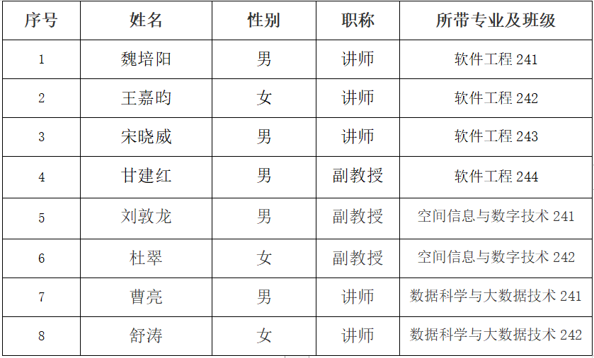 根据《成都信息工程大学本科生班导师制实施办法》《软件工程学院班导师工作指导意见》相关文件要求,为加强学院班导师队伍建设,充分发挥班导师在学生成长成才过程中的重要作用,经教师本人申请、系部推荐、资格审查,拟选聘魏培阳等八位教师为2024级本科新生班导师。现将具体名单公布如下: