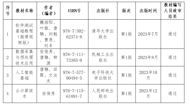 为落实《教育部关于印发<普通高等学校教材管理办法>》(教材〔2019〕3号)文件中教材编写应“凡编必审”“凡选必审”的要求,学院召开党政联席会对2023年度出版教材展开审核工作,对编写人员政审情况、知识产权情况、内容先进性及系统性、内容意识形态等方面综合审定后,讨论通过2023年度4本出版教材均符合出版要求。现将《软件工程学院2023年自编出版教材列表》进行公示,详见附件。如有情况需反映,请反馈至学院教务办(双中心A510)。