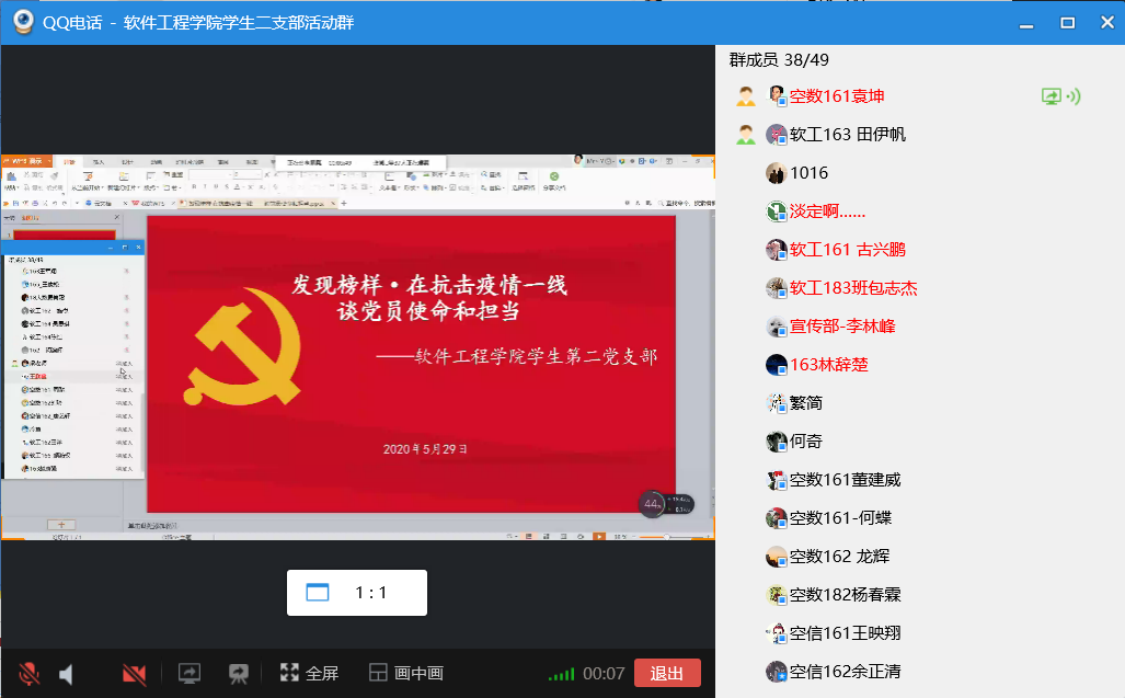 在习近平总书记亲自指挥、亲自部署和党中央、国务院坚强领导下,全国各族人民共同努力,取得了抗击新冠肺炎疫情的阶段性重大胜利。为充分展示我院学生党员在疫情防控工作中的先进事迹,激励学生党员在关键时刻积极担当、主动作为,软件工程学院学生第二党支部于2020年5月29日举行了“学榜样,担使命”专题学习活动。