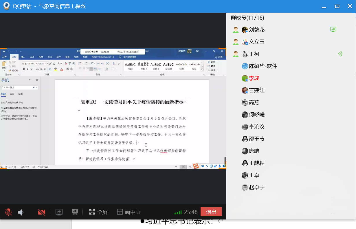 5月24日,气象空间信息工程系党支部召开了党员组织生活会,受新型冠状病毒肺炎疫情的影响,经过党支部讨论,此次党员组织生活会采用QQ电话(语音通话)这种全新的学习方式。会议由系党支部书记王柯主持,组织委员刘敦龙同志领学,支部全体党员参加了会议。