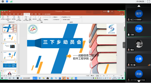 为了更好地开展成都信息工程大学大学生暑期“三下乡”社会实践活动,2020年7月27日晚7点,我院举行“三下乡”社会实践活动线上动员大会。软件工程学院团委书记万娟,青年志愿者协会负责人以及志愿者代表参加了本次大会。