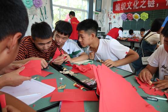 青春献礼,非遗文化焕生机。实践队成员将传统文化带进中学课堂,为当地学生教授剪纸、中国结等传统艺术,让当地学生切身感受中华民族优秀传统文化。同学们在趣味中感受艺术,并结合“建党节”进行创作,将自己亲手制作的艺术品献给党,表达自己对党和国家的衷心祝福和美好憧憬。