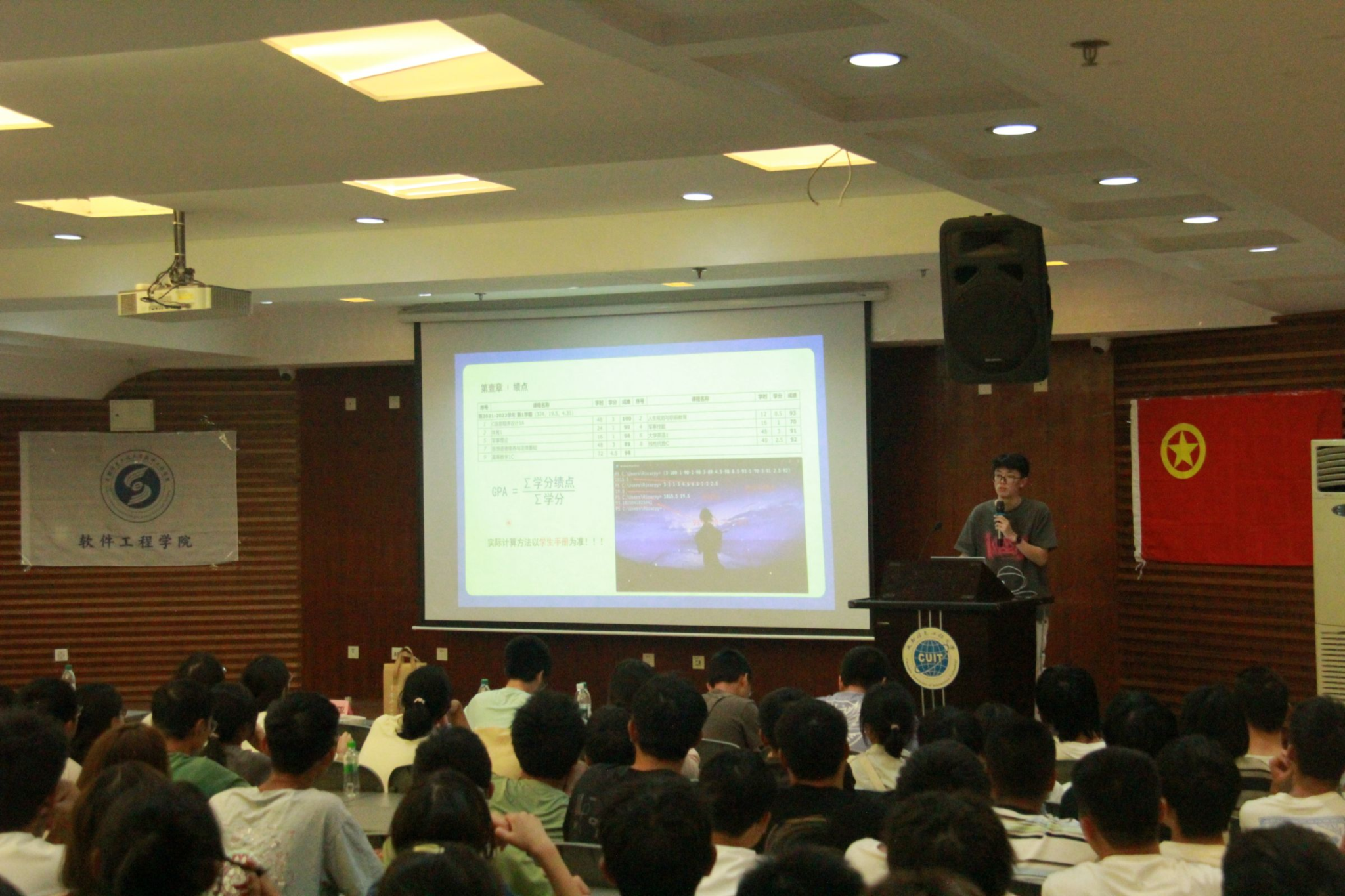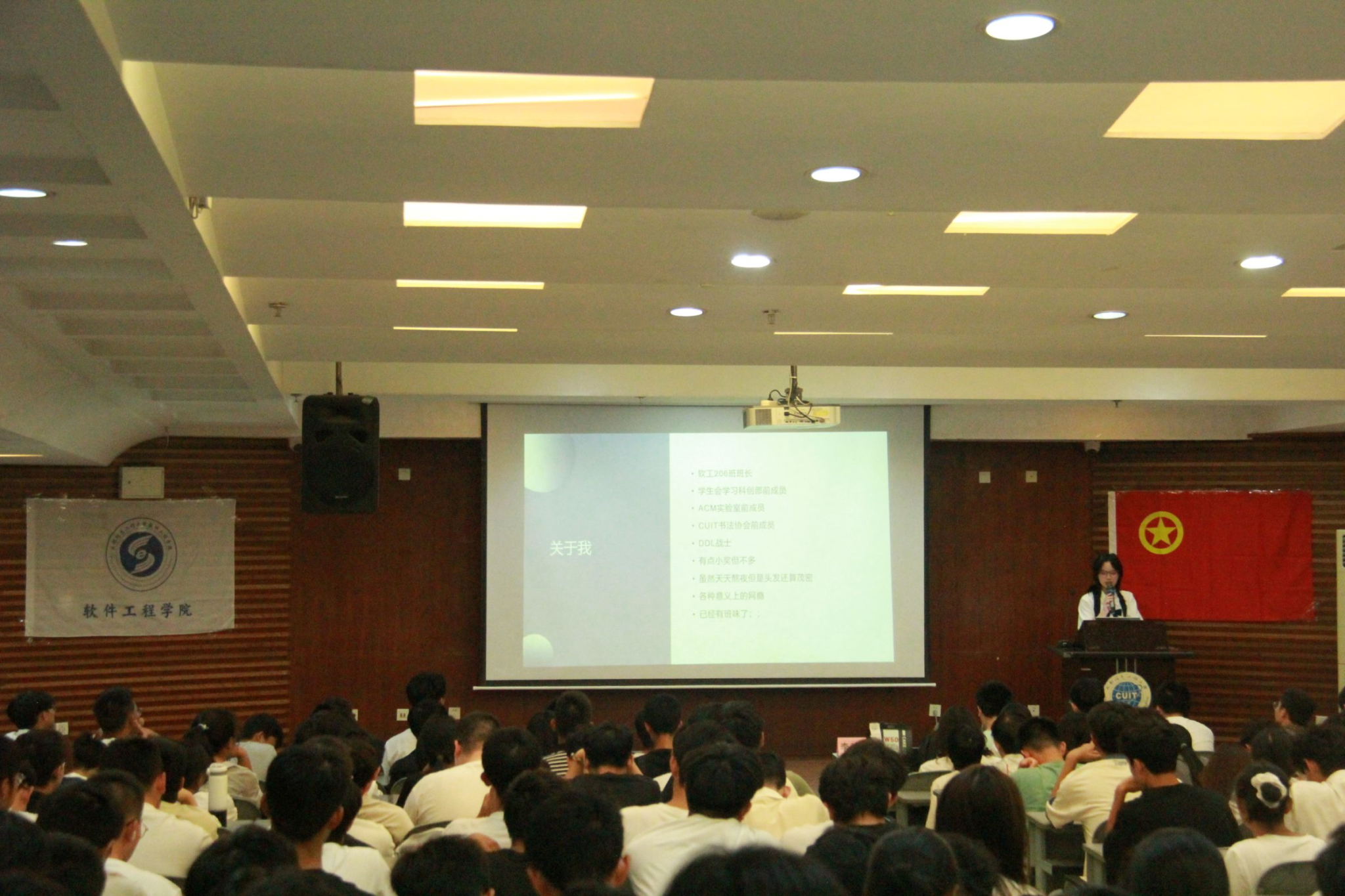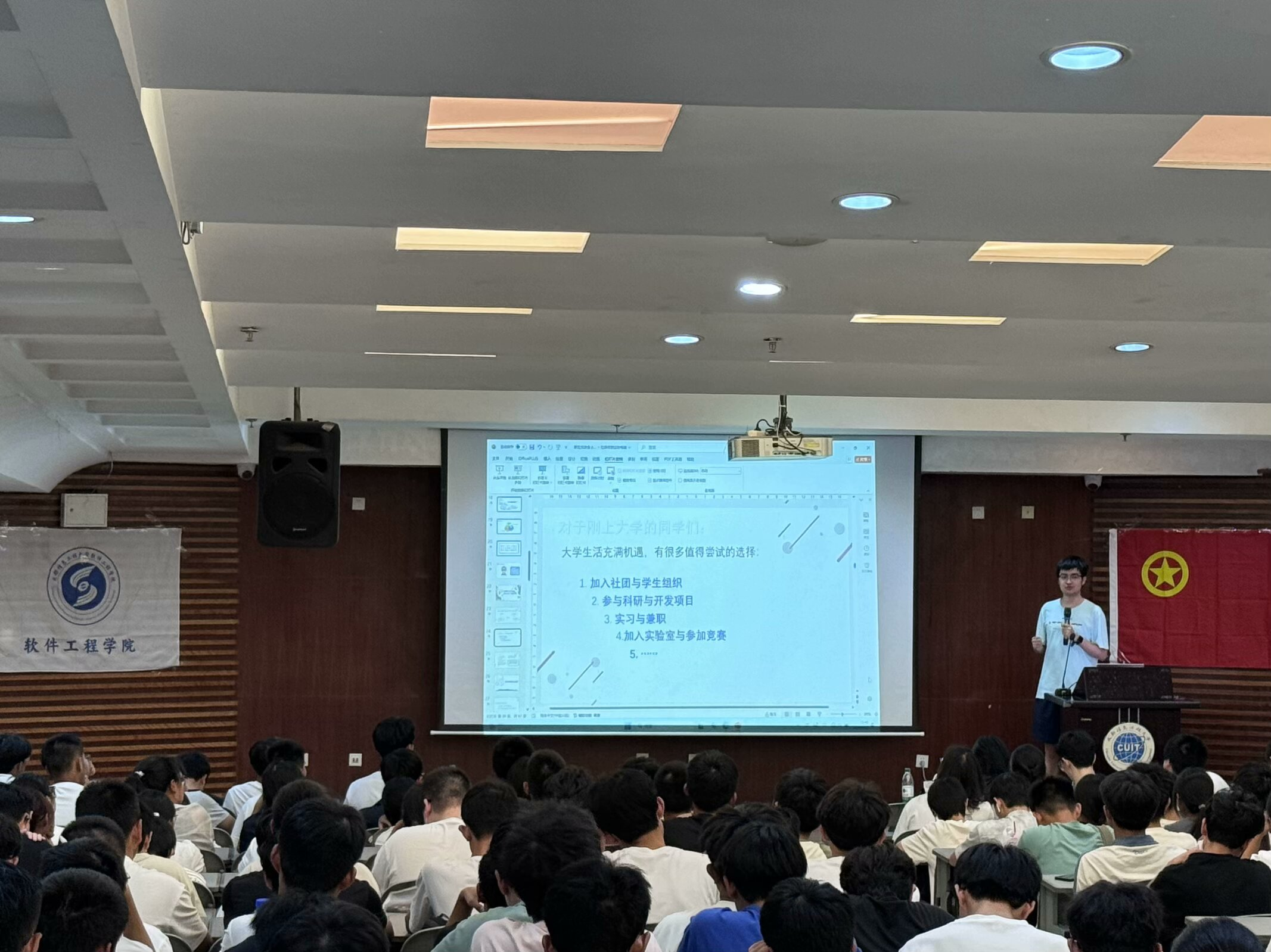云程发轫,干霄凌云。为帮助我院新生尽早适应大学生活,明确未来目标,软件工程学院团委学生会于9月22日晚7点在图书馆一楼学术报告厅举办第十六届新生交流会。学院优秀学生代表:软工212班李江平、软工234班刘雨葳和软工206班王童进行宣讲,软件工程学院2024级全体新生参与此次交流会。